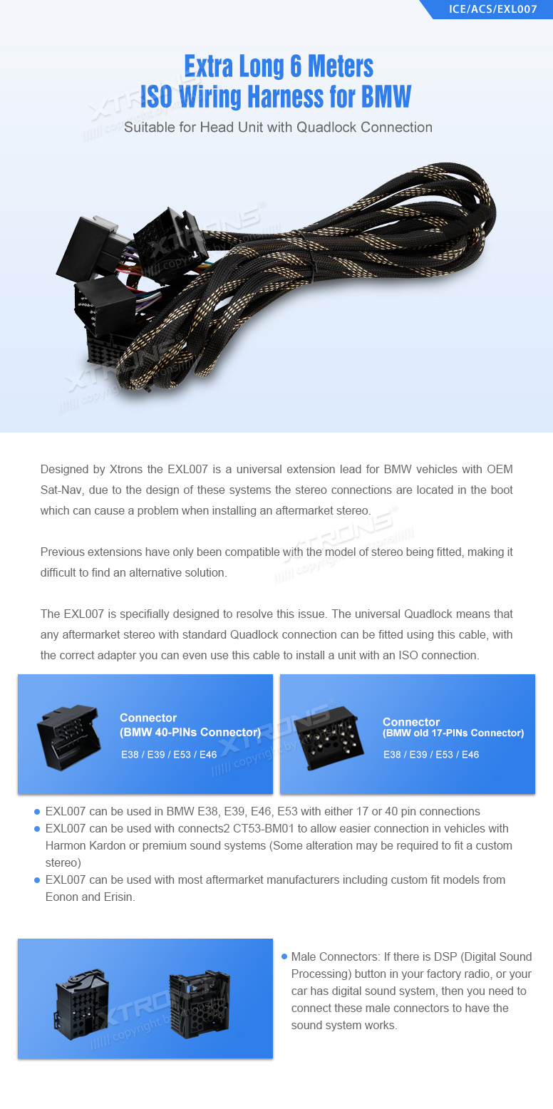 | Description | 6 Meters - 40 Pins Quadlock & 17 Pins Round Extension ISO Cable For BMW Universal extension lead for BMW vehicles with OEM Sat-Nav. Due to the design of these systems, the stereo connections are located in the boot which can cause a problem when installing an aftermarket stereo. Previous extensions have only been compatible with the model of stereo being fitted, making it difficult to find an alternative solution. It is specially designed to resolve this issue; the Universal Quadlock means that any aftermarket stereo with a standard Quadlock connection can be fitted using this cable, and with the correct adapter you can even use this cable to install a unit with an ISO connection Features