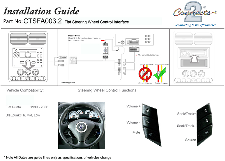 | Description | The CTSFA003.2 Steering Wheel Interface allows you to change the factory original headunit to an aftermarket car stereo whilst maintaining the use of your factory stalk/steering controls. Compatible with: Fitted with Mini ISO connector and Blaupunkt Hi, Mid, Low headunit
