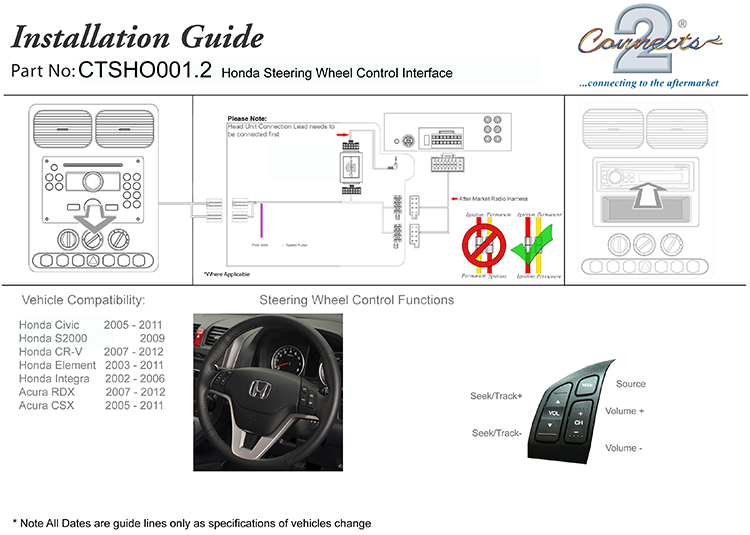 | Description | The CTSHO001.2 Steering Wheel Interface allows you to change the factory original headunit to an aftermarket car stereo whilst maintaining the use of your factory stalk/steering controls. Compatible with: