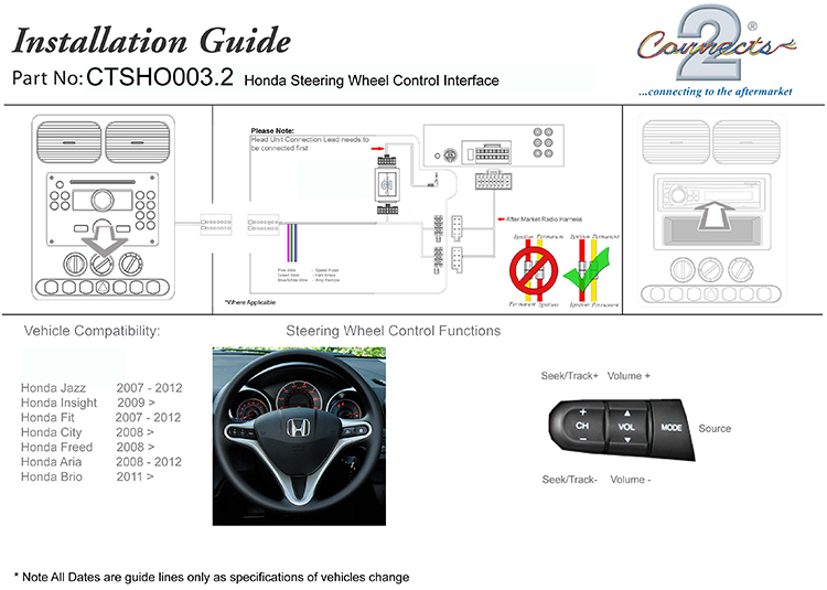 | Description | The CTSHO003.2 Steering Wheel Interface allows you to change the factory original headunit to an aftermarket car stereo whilst maintaining the use of your factory stalk/steering controls. Compatible with: