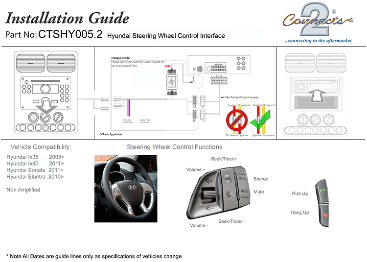 | Description | The CTSHY005.2 Steering Wheel Interface allows you to change the factory original headunit to an aftermarket car stereo whilst maintaining the use of your factory stalk/steering controls. Compatible with: Fitted with NON AMPLIFIED Hyundai Mobis headunit
