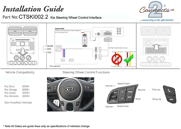 | Description | CTSKI002 Steering Wheel Interface for Kia The CTSKI002.2 Steering Wheel Interface allows you to change the factory original headunit to an aftermarket car stereo whilst maintaining the use of your factory stalk/steering controls. Compatible with: Fitted with Hyundai Mobis Headunits and is NON-AMPLIFIED