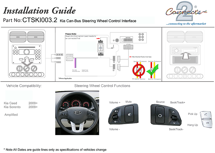| Description | CTSKI003 - Steering Wheel Interface for Kia The CTSKI003.2 Steering Wheel Interface allows you to change the factory original headunit to an aftermarket car stereo whilst maintaining the use of your factory stalk/steering controls. Compatible with: with Mini ISO Hyundai Mobis Headunits and AMPLIFIED SYSTEMS