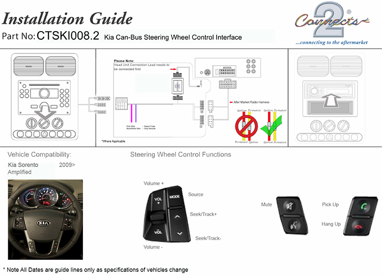 | Description | CTSKI008.2 - Steering Wheel Interface For Kia The CTSKI008.2 Steering Wheel Interface allows you to change the factory original headunit to an aftermarket car stereo whilst maintaining the use of your factory stalk/steering controls. Compatible with: Fitted with Hyundai Mobis Headunits and AMPLIFIED SYSTEMS