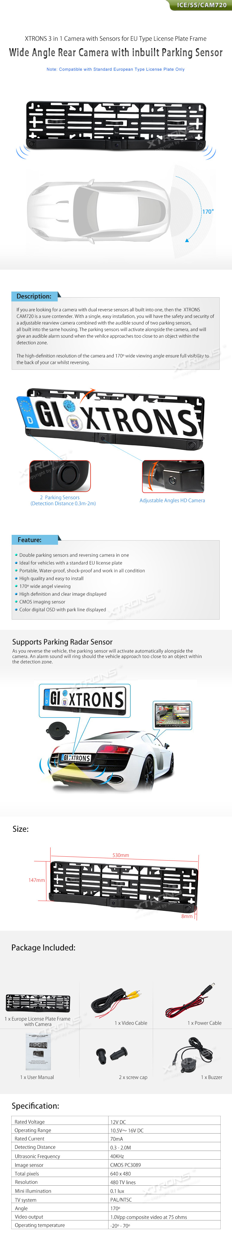 Description If you are looking for a camera with dual reverse sensors all built into one, then this product is a sure contender. With a single, easy installation, you will have the safety and security of a adjustable rearview camera combined with the audible sound of two parking sensors, all built into the same housing. The parking sensors will activate alongside the camera, and will give an audible alarm sound when the vehilce approaches too close to an object within the detection zone. The high-definition resolution of the camera and 170º viewing angle ensure full visibility to the back of your car whilst reversing.