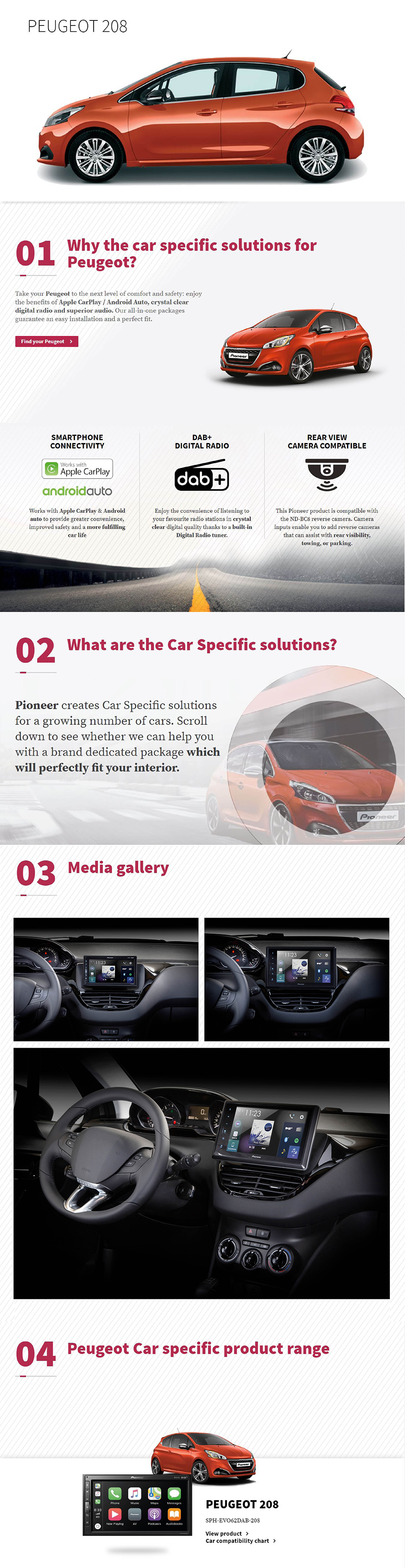 | Description | Pioneer SPH-EVO62DAB-208 Peugeot 208/2008 6.8" Apple CarPlay Android Auto DAB Spotify Car Stereo Upgrade your Peugeot 208 / 2008 (model year: 2012 - 2019) with our newest SPH-EVO62DAB-208 Multimedia Receiver, custom made to fit seamless in the interior. The new receiver feature DAB+ Digital Radio, both Android Auto™ and Apple CarPlay®, as well as entertainment features such as Spotify®, Bluetooth® streaming, WebLink®, FLAC file playback and more. Specifications