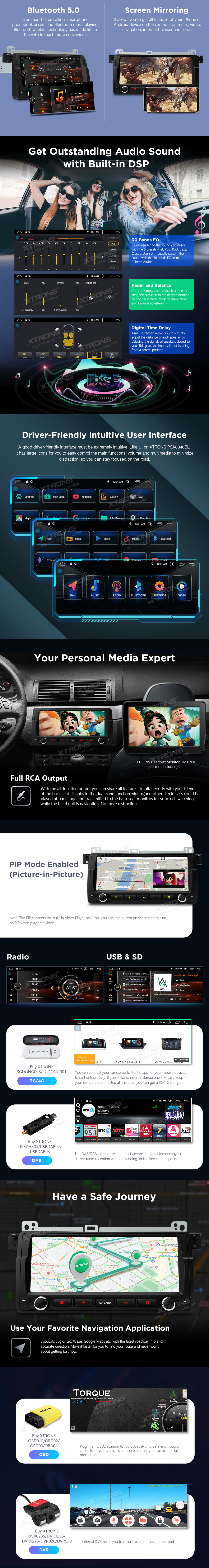 PERFECT FOR MUSIC AND IPHONE INTERACTION With support of voice commands, you can get more things done hands-free. Effortlessly stream or enjoy content from your smartphone, right there on the screen of your head unit. The unit also supports screen mirroring and Bluetooth, so you have more options to interact with your mobile phone. GET OUTSTANDING AUDIO WITH BUILT-IN DSP DRIVER-FRIENDLY INTUITIVE USER INTERFACE FULL RCA OUTPUT HAVE A SAFE JOURNEY IMMEDIATE ACCESS TO THE REVERSING CAMERA MODE ENTERTAINMENT EXPERIENCES & FUNCTIONALITY LIKE NEVER BEFORE 1080P Video Picture in Picture Optimised CANbus Decoding Steering Wheel Control Bluetooth Built-in Radio Tuner 4 x 50watt Amplifier Output Thickened Aluminum Heat Sink CUSTOMISE YOUR EXPERIENCE Explore your options and maximise your system with our range of accessories. Make the most of in-car technology. DAB+ XTRONS USBDAB01/USBDAB02/USBDAB03 is compatible TPMS XTRONS TPMS07 are compatible OBD2 XTRONS OBD01, OBD02, OBD03 and OBD04 are compatible DVR XTRONS DVR023S, DVR025S, DVR027S, DVR028, DVR029 are compatible KEYBOARD XTRONS AMK003 is compatible 4G XTRONS 4GDONG001 and 3GDONG008 are compatible CAMERA XTRONS CAM005/CAM006/CAM007/CAM009/CAM001F are compatible Microphone XTRONS MIC001 & MIC002 & MIC003 & MIC004 are compatible SIZE