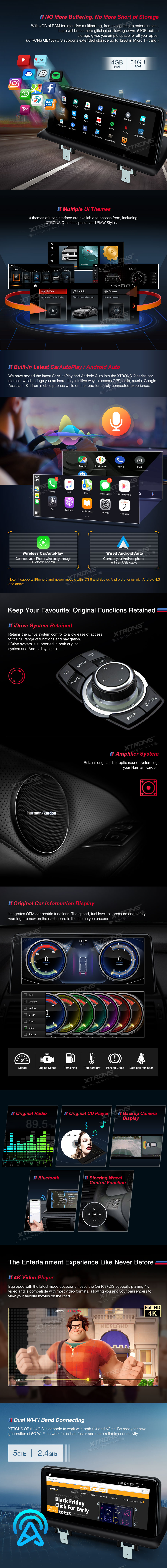This unit is for above BMW vehicles that come with NO original display Please buy XTRONS QBS8719CCS if your vehicle come with CCC system. A BREAKTHROUGH IN SPEED BOOTS IN SECONDS It delivers better power efficiency and stronger processing capabilities to handle complex tasks, to allow you to explore more fun in the latest Android OS. DUAL SYSTEM, PERFECT INTEGRATION EXCELLENT MULTITASK CAPABILITY BUILT-IN LATEST CAR AUTO PLAY/ANDROID AUTO IPS ANTI-REFLECTIVE TOUCH SCREEN Catch every single crisp, clear and vibrant picture from the expansive 178° viewing angle, without eye fatigue or discomfort. ENTERTAINMENT EXPERIENCES & FUNCTIONALITY LIKE NEVER BEFORE Intuitive User Interface Large icons for you to easily control the main functions, so you can stay focused on the road. 4K Video Player Equipped with the latest video decoder, supports playing 4K video and is compatible with most video formats, allowing you and your passengers to view all of your favourite movies on the road. Built-in GPS Receiver Module with External GPS Antenna Supports Sygic, iGO, Waze and any other navigation software that is compatible with Android OS. Never worry about getting lost now. Hands-free Calls and Audio Streaming - Supports Bluetooth 5.0 A discrete Bluetooth module, which ensures full compatibility with the latest phones with Bluetooth 5.0 Dual Band Wi-Fi Connecting Works well with both 2.4GHZ and 5GHZ WiFi. Be ready for the new generation of 5G networks for better, faster and more reliable connections DAB+ Tuner Ready Connecting a USB radio receiver stick and you can enjoy better sound quality and stronger signal to digital audio channels. (DAB+ radio receiver stick is not included. XTRONS USBDAB01, USBDAB02, and USBDAB03 are compatible). iDrive System Retained Retains the iDrive system control to allow ease of access to the full range of functions and navigation. (iDrive system is supported in both the the original system and Android system.) Amplifier System Retains original fibreoptic sound system, e.g., your Harman Kardon. CUSTOMISE YOUR EXPERIENCE Explore your options and maximise your system with our range of accessories. Make the most of in-car technology. DAB+ XTRONS USBDAB01/USBDAB02/USBDAB03 is compatible TPMS XTRONS TPMS07 is compatible OBD XTRONS OBD04 is compatible DVR XTRONS DVR023S, DVR025S, DVR027S, DVR028 and DVR029 are compatible KEYBOARD XTRONS AMK003 is compatible 4G XTRONS 4GDONG001 and 3GDONG008 are compatible CAMERA XTRONS CAM005/CAM006/CAM007/CAM009/CAM001F are compatible Microphone XTRONS MIC001 & MIC002 & MIC003 & MIC004 are compatible SIZE