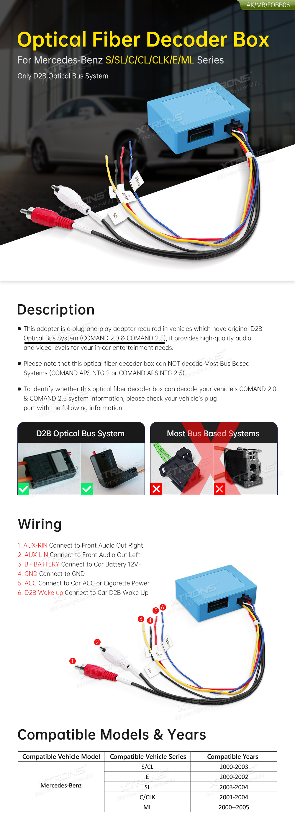| Description | D2B Optical Fiber Decoder Box for Mercedes-Benz S/CL / E / SL / C/CLK/ML Series This is a plug-and-play adapter required in vehicles which have an original D2B Optical Bus System (COMAND 2.0 & COMAND 2.5 Systems), it provides high-quality audio and video for your in-car entertainment needs. Please note that this optical fibre decoder box will NOT decode the MOST Bus Base System (COMAND APS NTG 2 or COMAND APS NTG 2.5) To identify whether this optical fibre decoder box can decode your vehicles COMAND 2.0 & COMAND 2.5 system information, please check your vehicle's plug port.