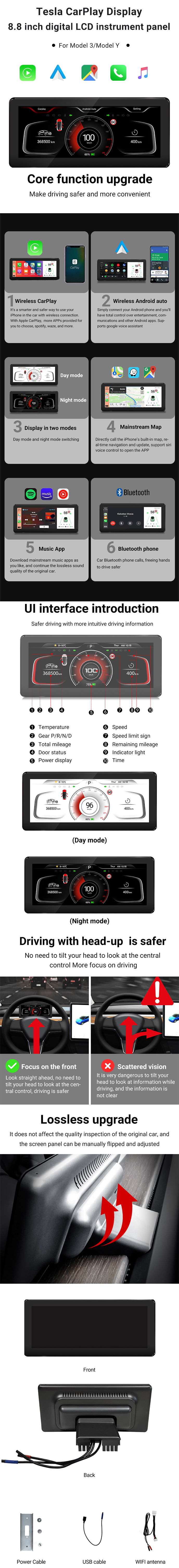 | Description | 8.8" Digital LCD Display with Apple CarPlay & Android Auto Multimedia Dashboard for Tesla Model 3 & Y Price includes professional fitting at our workshop in Leyton, London. Note: please allow up to 10 working days to be delivered This is a Tesla LCD instrument panel suitable for Model3/Y. It adopts an 8.8-inch screen design, which is more suitable for the driver’s viewing angle. You can also adjust the position by flipping the screen angle to achieve the best display position. This digital LCD instrument panel upgrades the functions of the original car while retaining the original car protocol, which can be controlled by the steering wheel buttons and the touch screen. The Carplay function is realized by means of a hardware professional Carplay chip, which has the advantages of fast connection speed and high stability. While you are enjoying the Carplay function, you can also monitor real-time speed, speed, gear and other data information that is helpful for safe driving. Car Compatibility Tesla Model 3 (2017 - 2022) Tesla Model Y (2020 - 2022) Key Features