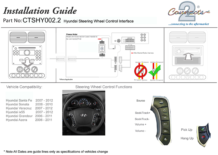 | Description | The CTSHY002.2 Steering Wheel Interface allows you to change the factory original headunit to an aftermarket car stereo whilst maintaining the use of your factory stalk/steering controls. Compatible with: Fitted with the NON AMPLIFIED Hyundai Mobis headunit
